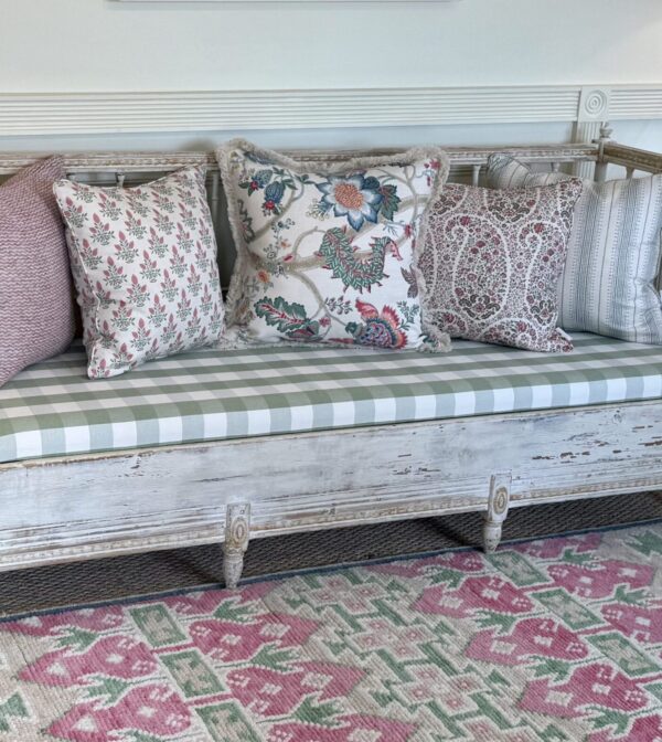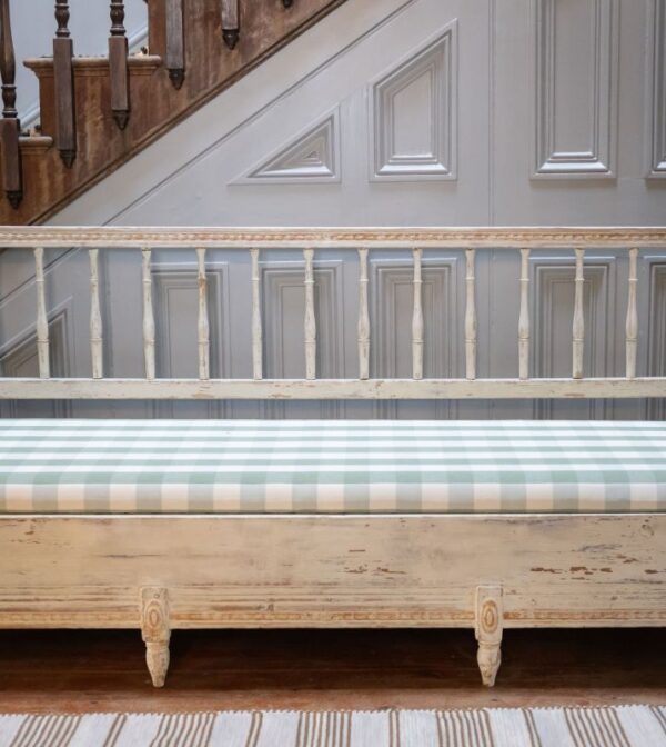 This stunning Swedish stool has been re-upholstered in Nicky Haslam’s Seafern in Haystack Yellow. Painted with gilt highlights. A truly beautiful piece.