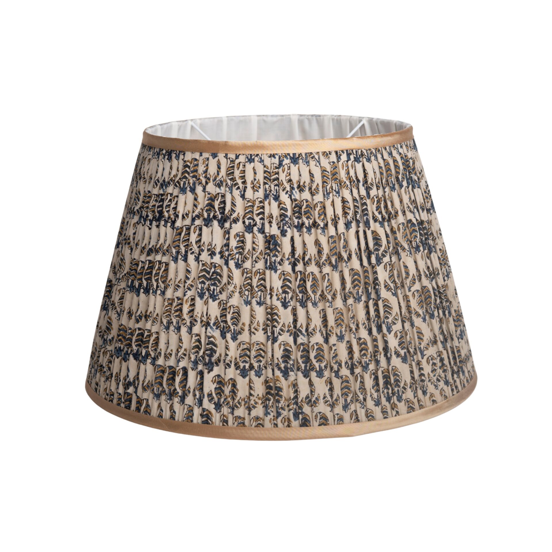 Blue and cream cotton block print fabric sourced from India with dupion silk trim. Hand stitched in the UK by our artisan team.