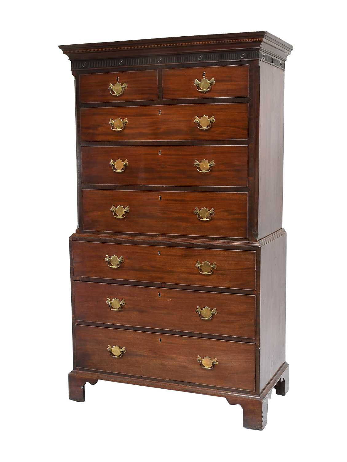 A George III Mahogany and Oak-Lined Chest on Chest, late 18th century, the moulded top above a satinwood and mahogany parquetry-decorated border above a fluted moulding and two short over three long oak-lined drawers, all between canted fluted stiles, the base with three deep drawers with later brasses, on bracket feet