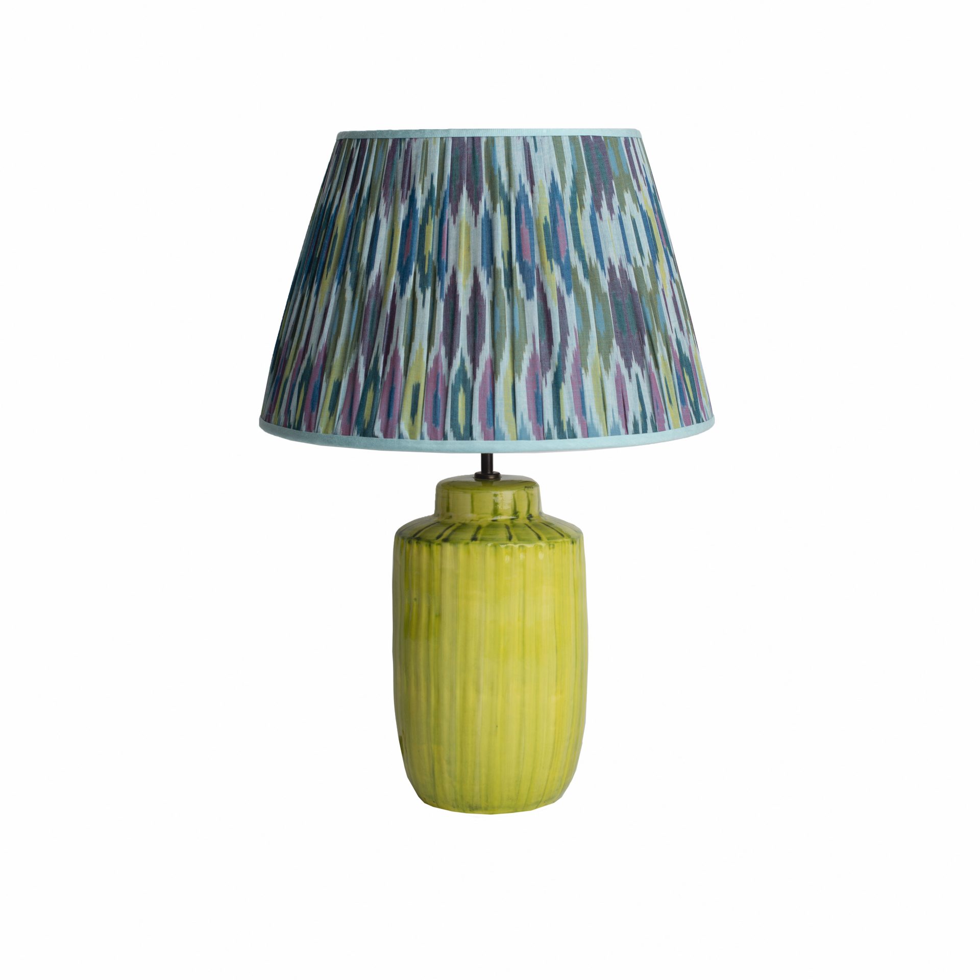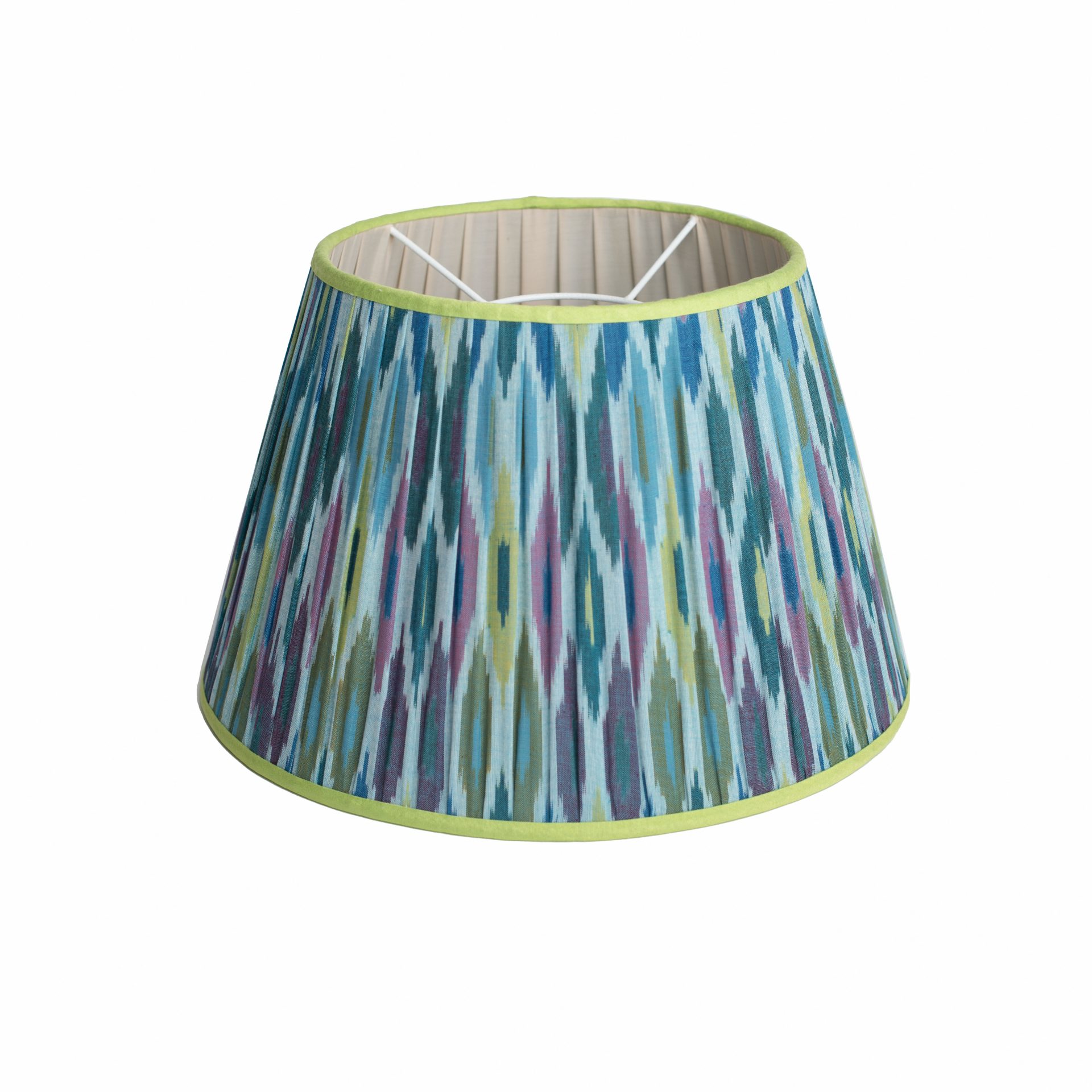 Hand sewn bespoke pleated Ikat Lampshade made our artisan team in the UK in a Silk and Cotton mix sourced from Uzbekistan. As this is a hand woven and hand dyed fabric we advise to avoid direct sunlight. Image shown on lamp base is slightly different to the actual product. The blue trim version has sold out.