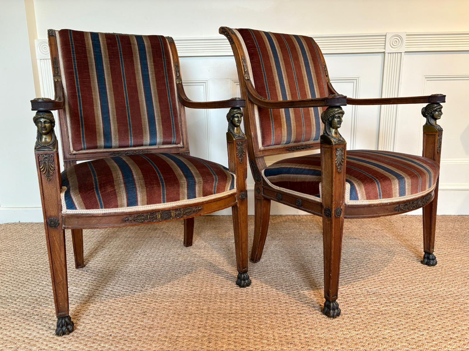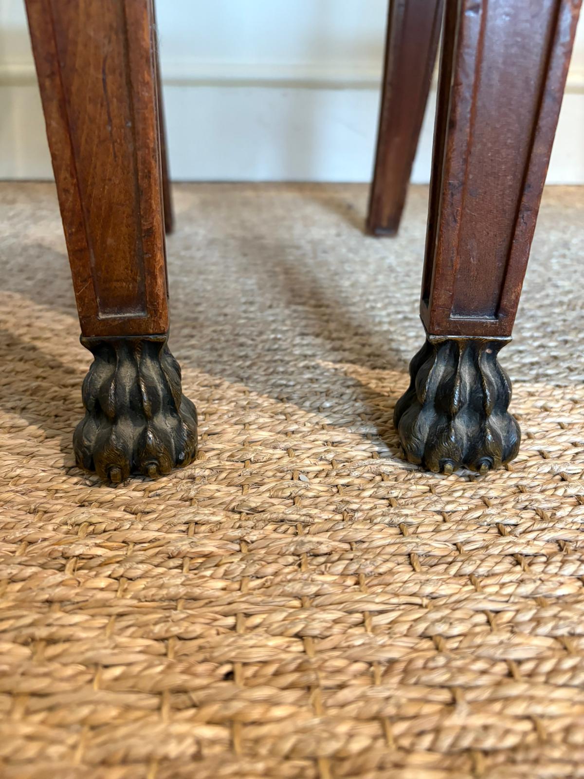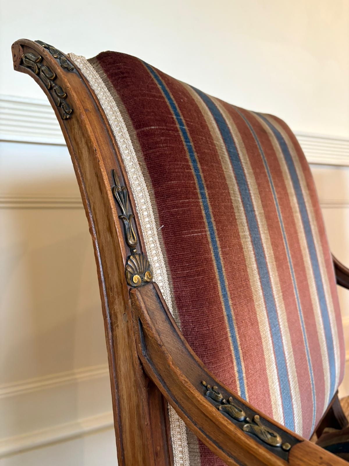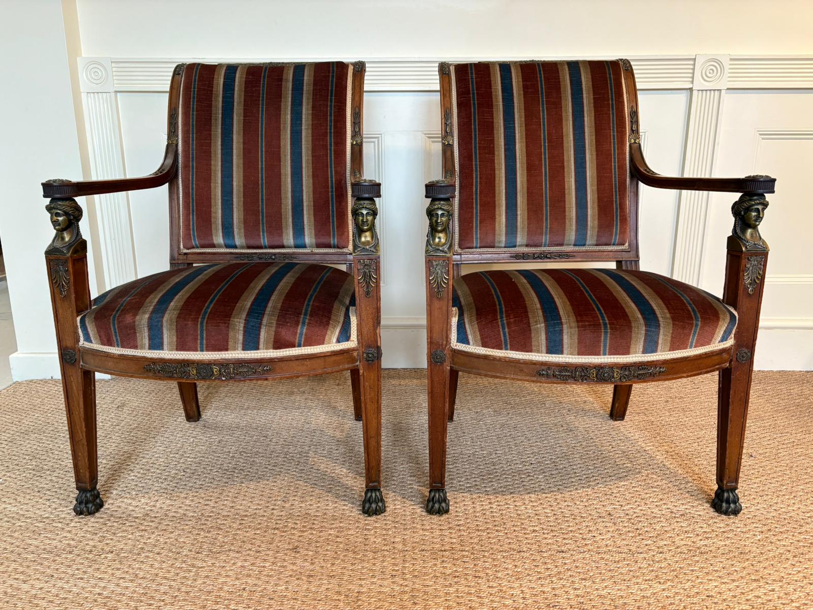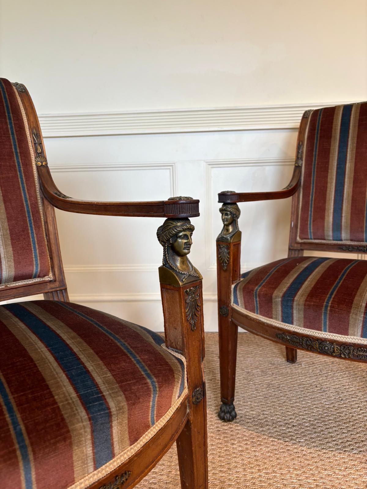 Stunning pair of 19th Century Empire side chairs with Ormolu detailing. Great for a hallway or dining room flanking a wonderful console or server. French circa 1870